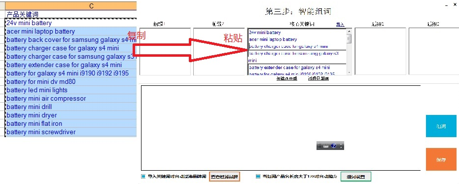 本软件支持用户直接使用自己的关键词,可以来自任何文件,复制粘贴到智能组词里面即可(如图),里面的表格线只需要点【关键词去重】后会自动消失。