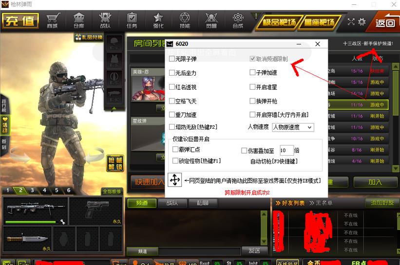 枪林弹雨神奇辅助是专门为同名页游《枪林弹雨》打造的游戏修改器,这款辅助可以帮助枪林弹雨玩家开启无限子弹、无后坐力、子弹加速、红名透视、空格飞天、狙击准心、无限穿墙、人物加速、塔防无敌、锁定怪物等等功能,该辅助已经破解,下面有具体的使用教程,欢迎下载体验!