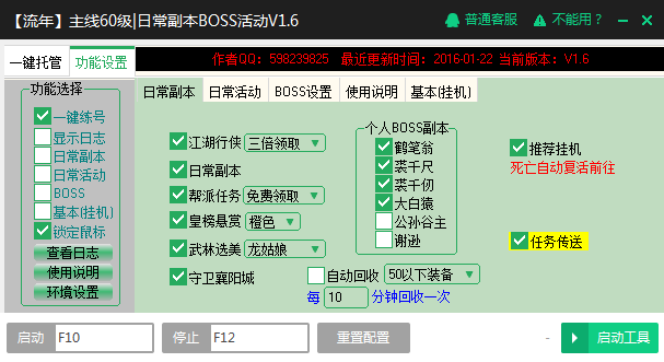 功能:【兼容win7/xp】【一键主线60/任意等级,稳定快速】【自动喊话】【每日签到】【个人BOSS】【更多功能增加中】