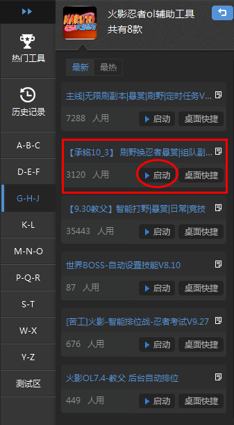 4.在火影忍者ol辅助工具中“启动”“火影忍者ol【承铭】主线|无限刷副本|悬赏|定时任务”