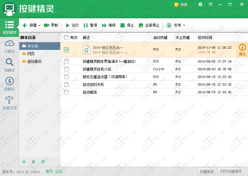 6、然后会在我的脚本里面看到一个2014天猫抢红包五合一的脚本,勾选脚本,打开活动页面。F10开启脚本;F12终止脚本。