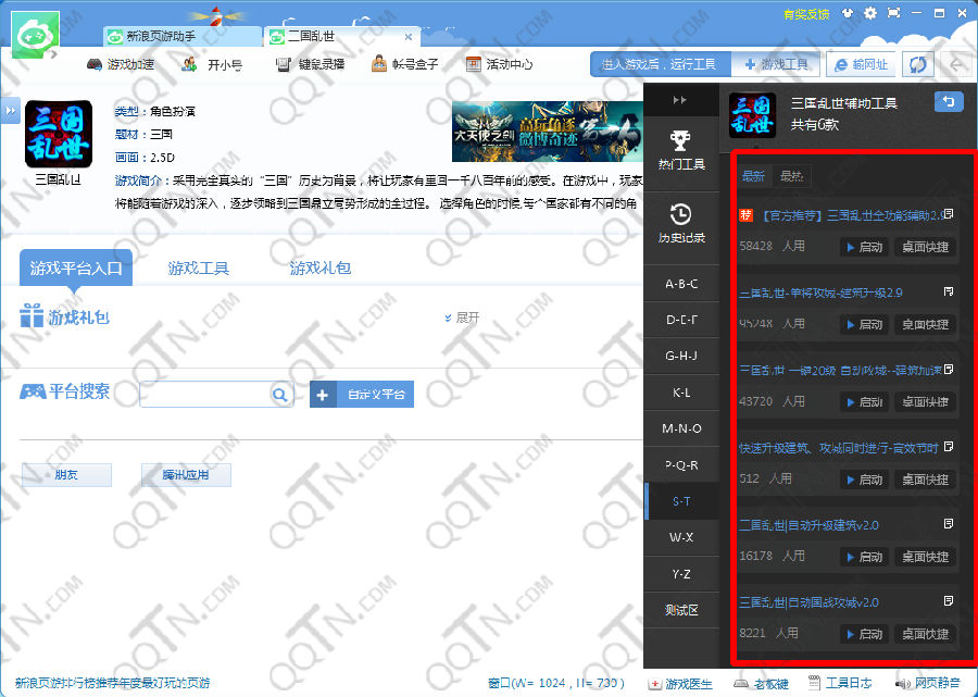 2、进入新浪页游助手,如下图所示,搜索游戏“三国乱世”