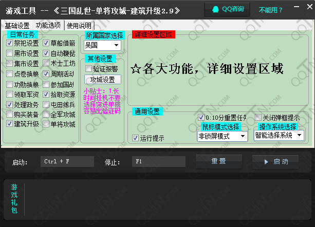 这是一款用于三国乱世游戏中建筑升级和单将攻城的辅助工具,同时还提供了所有的日常任务挂机功能,包括处理政务、购买装备、屯田练兵等等。辅助能够智能判断玩家操作系统,简单进行配置就能每天使用本辅助进行挂机了,轻松游戏从此刻开始!