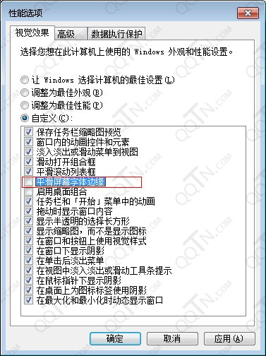 3、将平滑字体边缘去掉。XP:我的电脑->右键->属性->高级->性能设置->点击调整为最佳外观->取消平滑字体屏幕边 缘