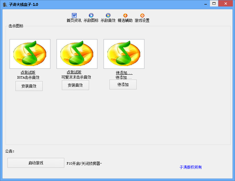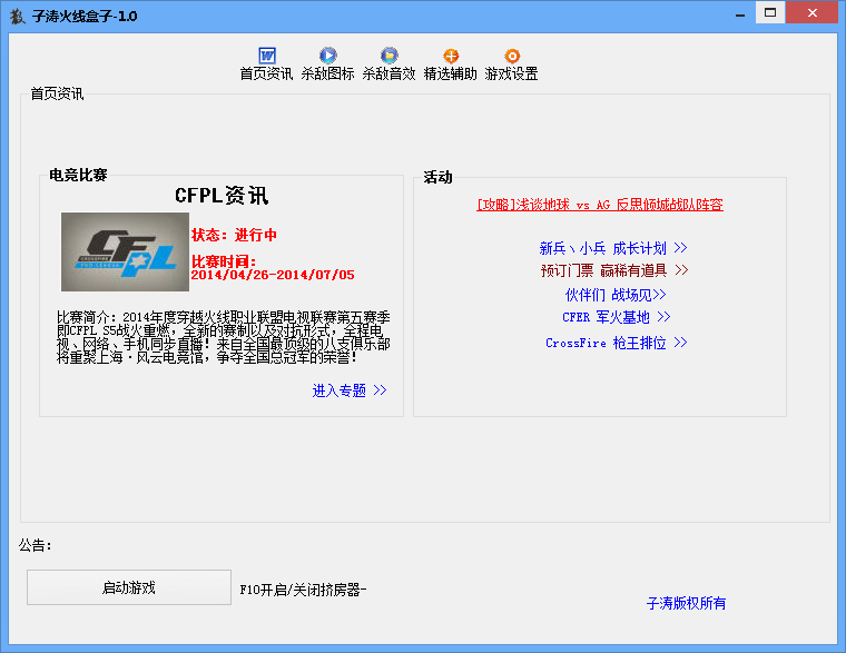 子涛火线盒子目前提供游戏资讯、杀敌图标、杀敌音效、辅助推荐四类功能,使用时请先到游戏设置界面选择游戏路径再使用。