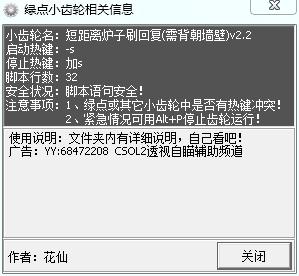 CSOL2蓝精灵半自动脚本拥有各种不同功能的游戏脚本,共10款,是采用绿色小齿轮运行,使用时请注意绿点或其他小齿轮中是否有热键冲突,紧急情况可用ALT+P停止齿轮运行。