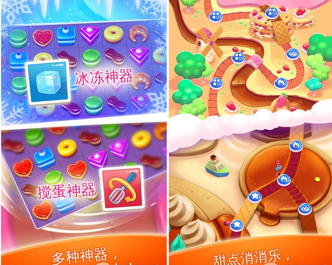 各种强大的神器,能够冻结时间,重新排列甜点等,助你轻松挑战各大关卡!