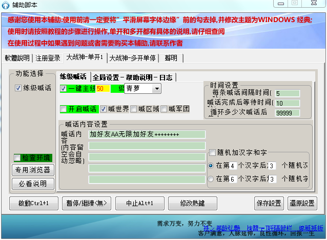使用大战神辅助脚本就能享受一键主线50级的自动挂机升级体验,并支持全模式自动喊话功能,一次最多可设置5条哦。