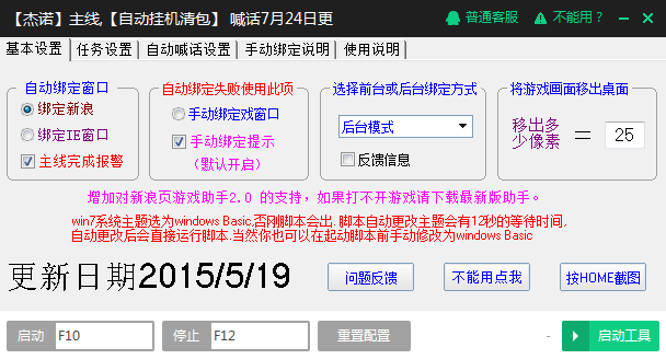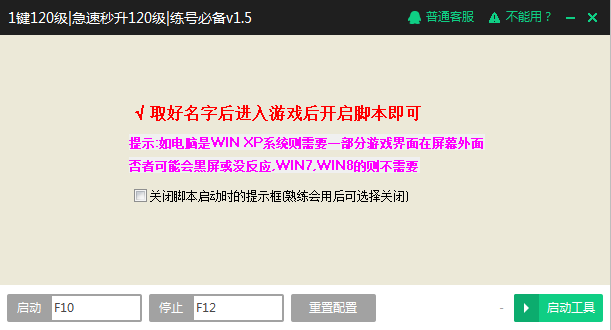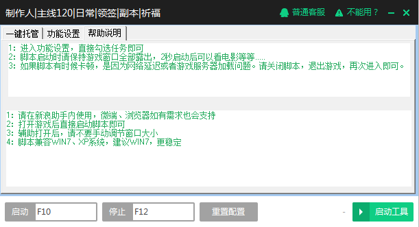 功能:【兼容win7/win8/xp】【一键主线60/120/任意等级,稳定快速】【组队副本】【日常任务】【每日奖励】【自动喊话】【更多功能增加中】
