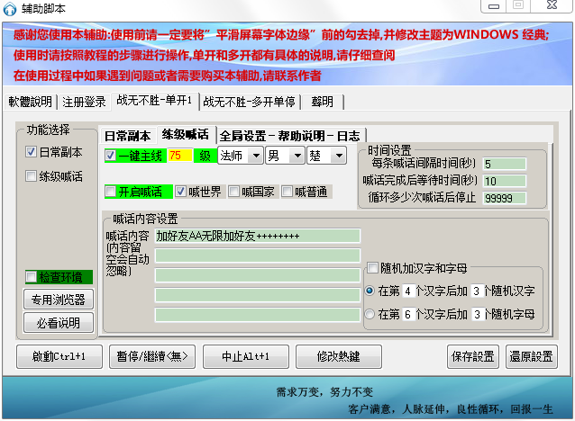 使用战无不胜辅助脚本修改功能后记得保存设置后再启动,提供了厉兵秣马、自动副本、押镖、野外挂机以及自动喊话等功能。
