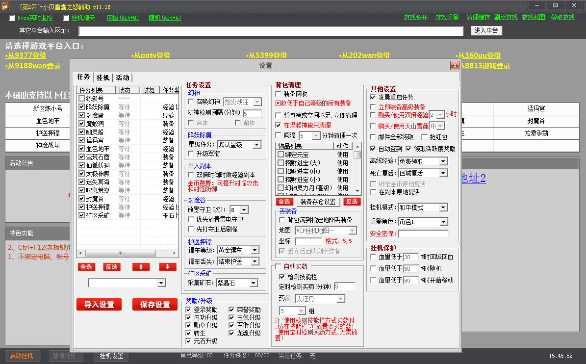 小贝雷霆之怒辅助是一款专门针对同名游戏《雷霆之怒》的一款游戏辅助工具,这款辅助功能超多,包括挂机刷怪、日常任务、副本、快速抢怪抢BOSS、自动做活动等等辅助功能,全服双倍定时定点进地图挂机模式,使挂机更人性化、抢boss更快,挂机效率远超于同类挂机辅助,是一款智能挂机辅助软件。