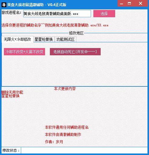 美食大战老鼠清澈辅助是一款最新的美食大战老鼠游戏辅助修改器,美食大战老鼠清澈辅助支持无冷却时间、火盆秒杀、vip成长等等功能,玩家可以通过这款辅助获得最佳的游戏体验,让你轻松玩游戏。