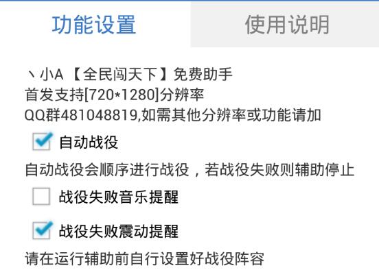 1、本辅助为免费辅助,首发支持720*1280、1080*1920分辨率,目前发布自动战役功能,需要其他功能或者分辨率请加QQ群481048819