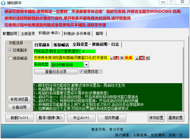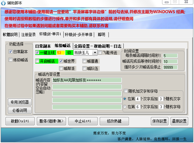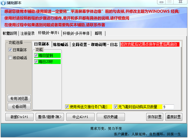 腾牛网提供的这款轩辕剑辅助脚本,是为轩辕剑之天之痕网页游戏设计的,支持微端、浏览器,提供了每日签到、自动喊话、自动练级等功能,修改功能后记得保存设置后再重启,方可生效。
