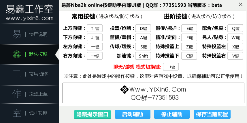 易鑫NBA2Kol按键助手是一款由易鑫工作室专门针对NBA2K online制作的按键精灵脚本,这款按键助手辅助支持一键投篮、上篮、盖帽、抢断、传球、掩护、晃人、包夹、稳定三分、后仰跳投、自动喊话等等功能,新版界面优化,算法优化,增加便利功能,欢迎喜欢玩NBA2K online的玩家朋友下载体验!
