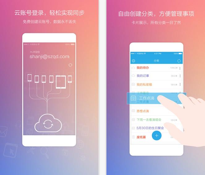 闪记云记事ios版是一款闪记笔记记事针对ios平台的闪记手机版APP,新版支持云账号功能,一键云同步,数据永不丢失,闪记ios版支持一键置顶、任意拖动排序、四向滑动、秒开提醒、手写涂鸦、语音转文字、语音记事、一键拍照、富文本、日程规划、待办事宜、云备份、密码锁等等强大好用的功能,欢迎下载体验!