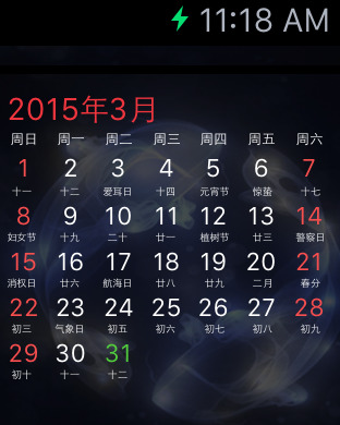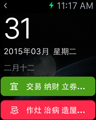 你可以非常方便的在Apple Watch上查看今天宜做什么, 忌什么,查看最近一年的节假日,如何调休,以及农历、节气、国际节日。